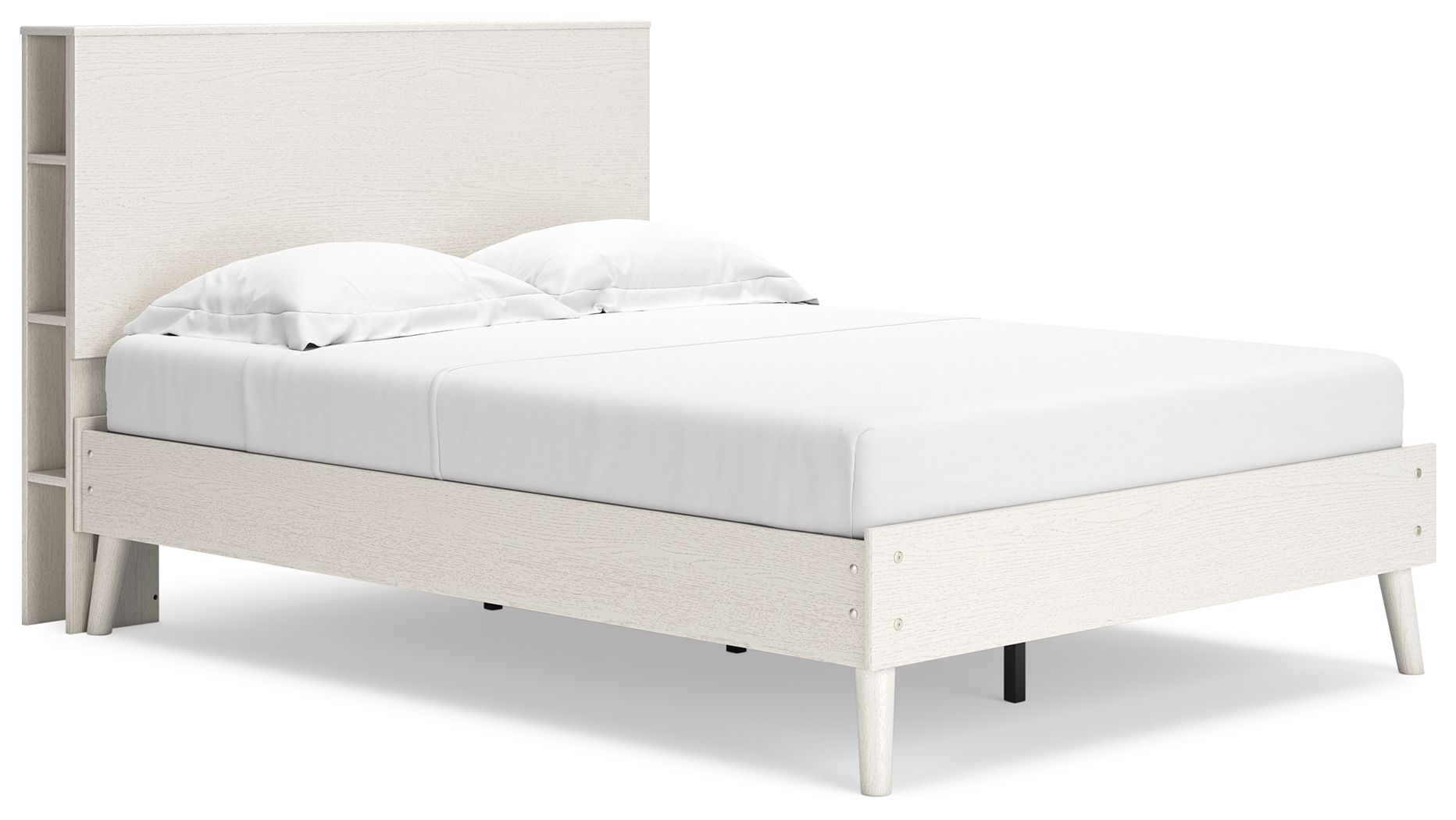 Dare to take minimalism to the max. This bookcase headboard has a richly relaxed feel thanks to its honey brown finish over replicated wood grain. A space-efficient storage option, cubbies along the side of the headboard ensure you can keep your favorite reads within reach. USB charging keeps up with your high-tech lifestyle. There's no doubt about it: This contemporary piece is sure to become a classic.