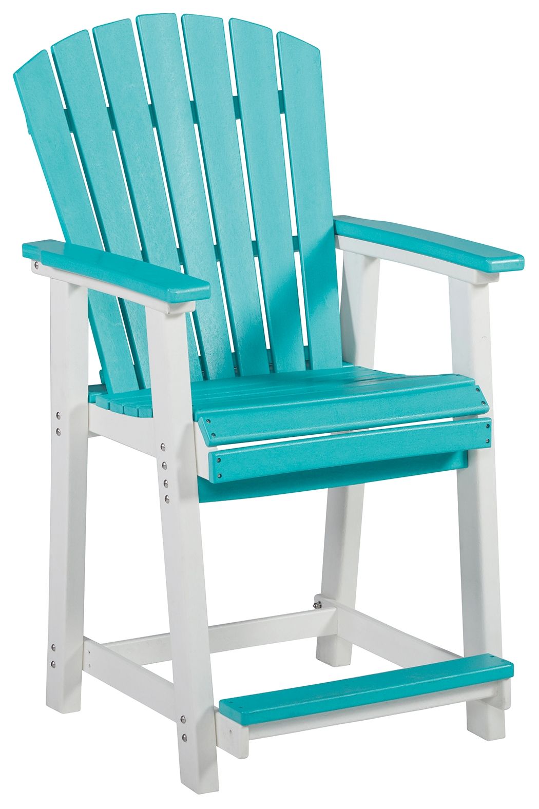 Raise the bar on outdoor living with this bar stool set. Crafted for style and durability, the counter height stool caters with sturdy armrests, an ample footrest, a high shell back and a waterfall wrapped seat for curvaceous comfort. The slatted design easily sheds rainwater. Adding to its appeal: a standout two-tone look that pairs a light turquoise and white for twice the interest.