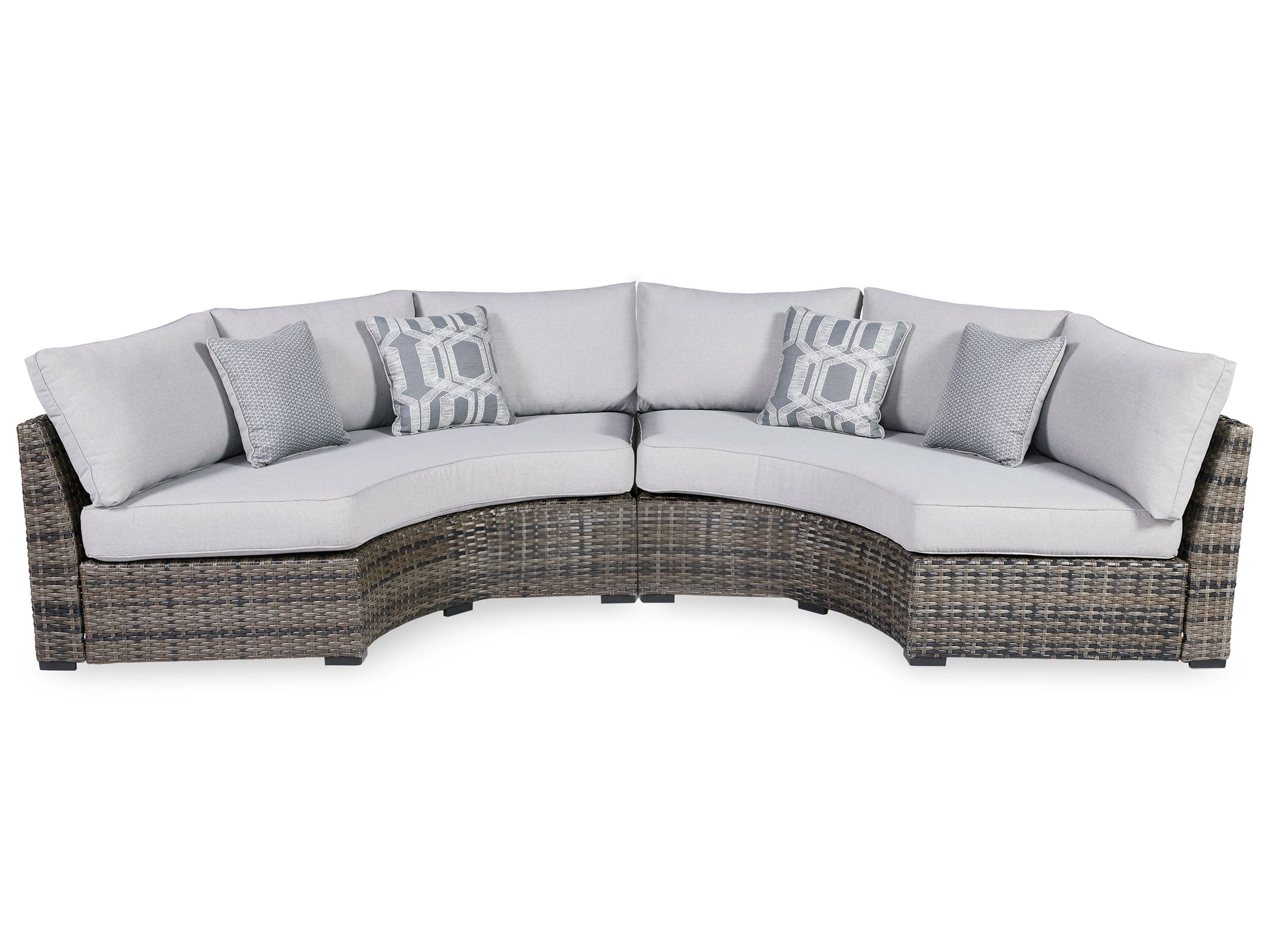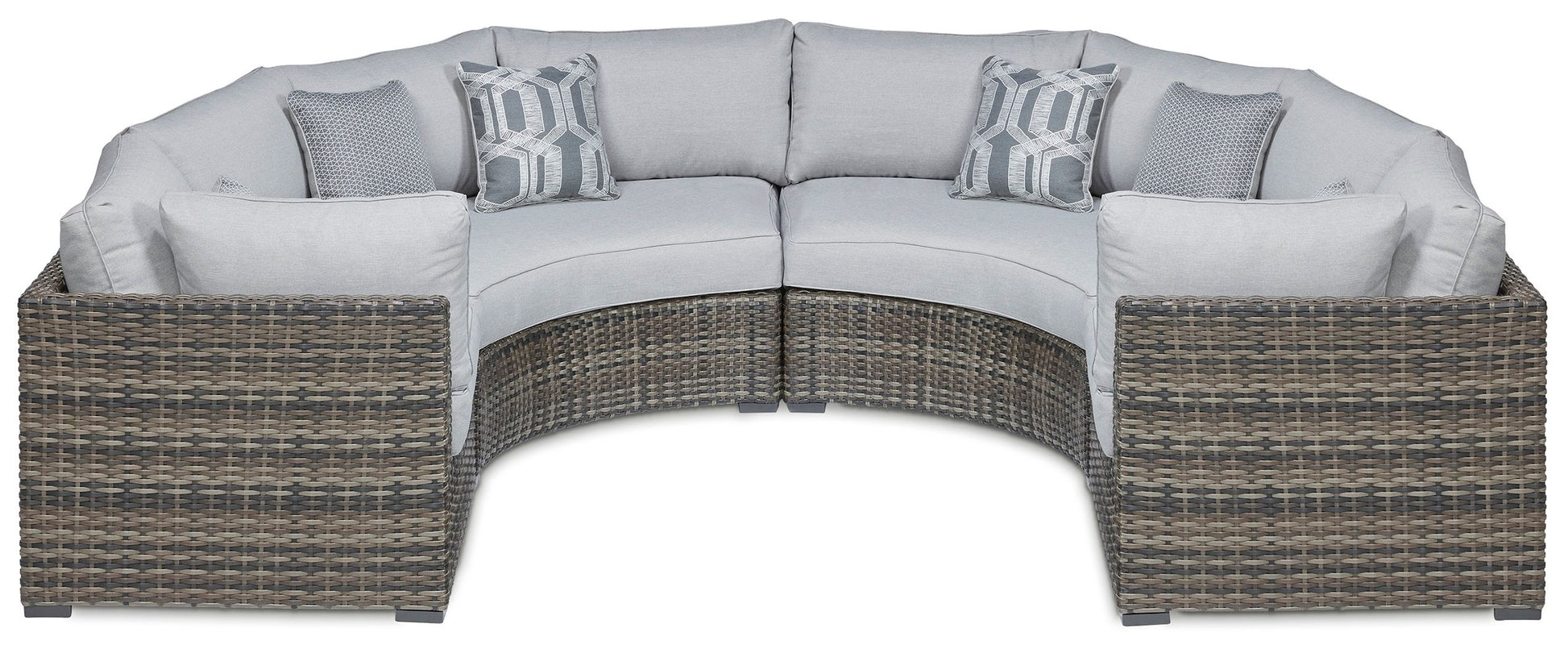 This cool, casual sectional raises the comfort level and visual appeal of your outdoor living space. Made of handwoven wicker in neutral tones of light and dark, the pieces blend beautifully into your lanai or pool and patio area. Thick, comfy cushions are wrapped in Nuvella® high-performance fabric that is stain resistant, fade resistant and easy to clean. Throw pillows add comfort and a splash of color.