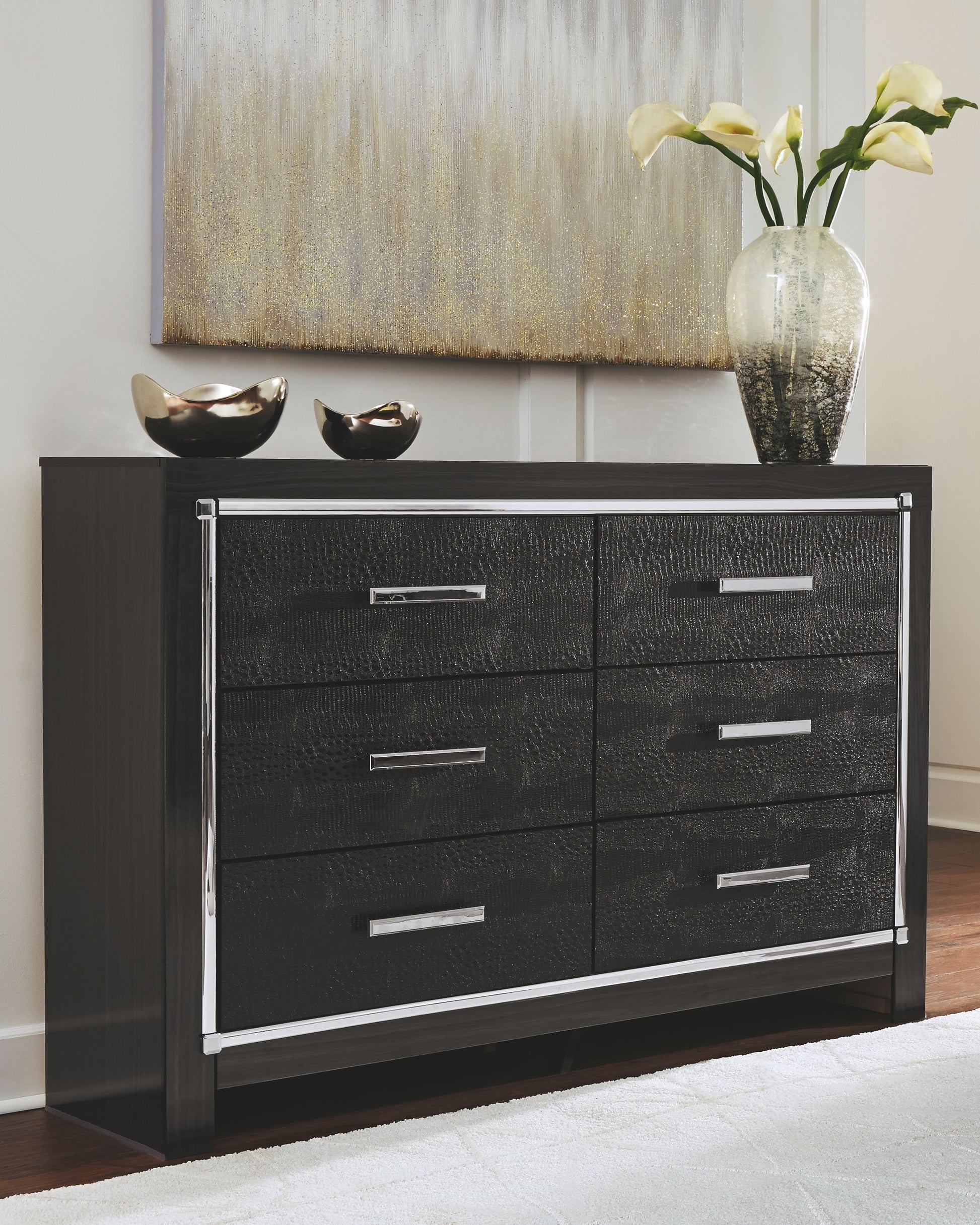 Kaydell - Black - 6 Pc. - Dresser, Mirror, Chest, King Upholstered Glitter Panel Bed